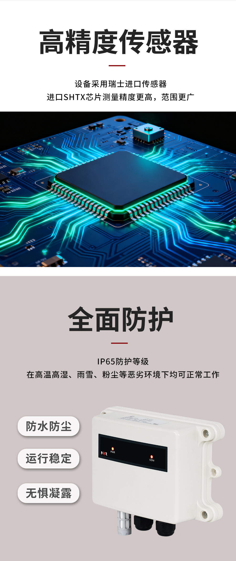 虹潤公司是專業(yè)生產(chǎn)環(huán)境監(jiān)測儀表的國家專精特新“小巨人”企業(yè)。生產(chǎn)的一體式溫濕度變送器,具有溫度、濕度、露點(diǎn)高精準(zhǔn)的測量與變送,報(bào)警繼電器輸出,RS485/RS232通訊,IP65防護(hù)等級(jí)等特點(diǎn)。產(chǎn)品獲得一種手持式低功耗溫濕度檢測儀、大屏幕溫濕度記錄儀等2項(xiàng)國家發(fā)明專利,主持起草物聯(lián)網(wǎng)智能溫度儀表通用技術(shù)條件、冷鏈溫度記錄儀等2項(xiàng)國家標(biāo)準(zhǔn),以及通信系統(tǒng)多通道數(shù)據(jù)采集控制終端規(guī)范軍用標(biāo)準(zhǔn),以及現(xiàn)場設(shè)備集成等5項(xiàng)智能制造國家標(biāo)準(zhǔn),參與國際5G標(biāo)準(zhǔn)制定,取得溫濕度儀表等3項(xiàng)相關(guān)軟件著作權(quán)。產(chǎn)品廣泛應(yīng)用于工業(yè)現(xiàn)場、農(nóng)業(yè)大棚、倉儲(chǔ)物流、地下管廊、養(yǎng)殖孵化、配電機(jī)房等諸多領(lǐng)域。