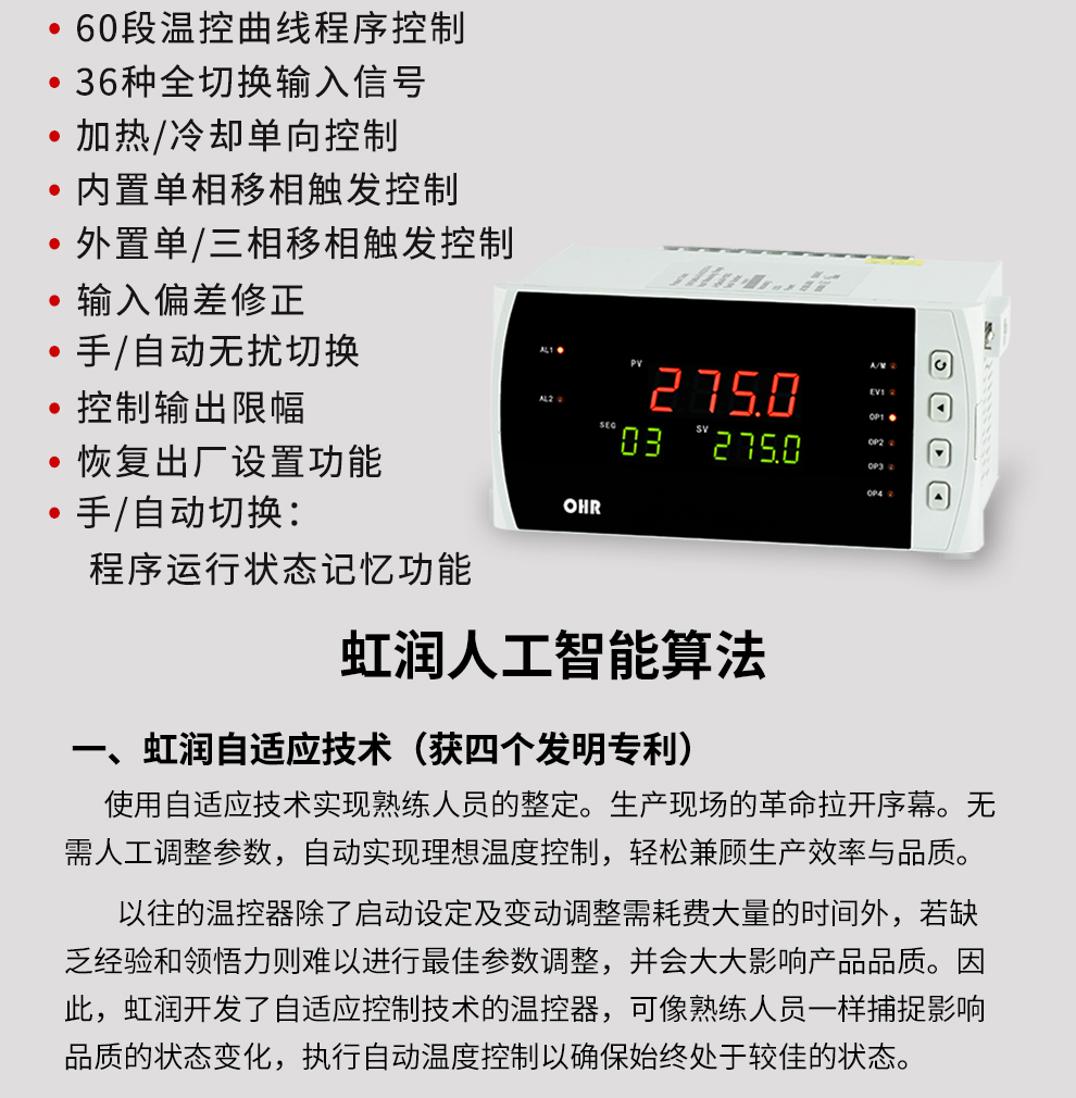 OHR-E400系列60段人工智能溫控器采用真正的人工智能算式,儀表啟動自整定功能,可以根據被控對象的特性,自動尋找參數以達到很好的控制效果,無需人工整定參數。控溫精度基本達±0.1℃,無超調、欠調,達國際先進水平。
