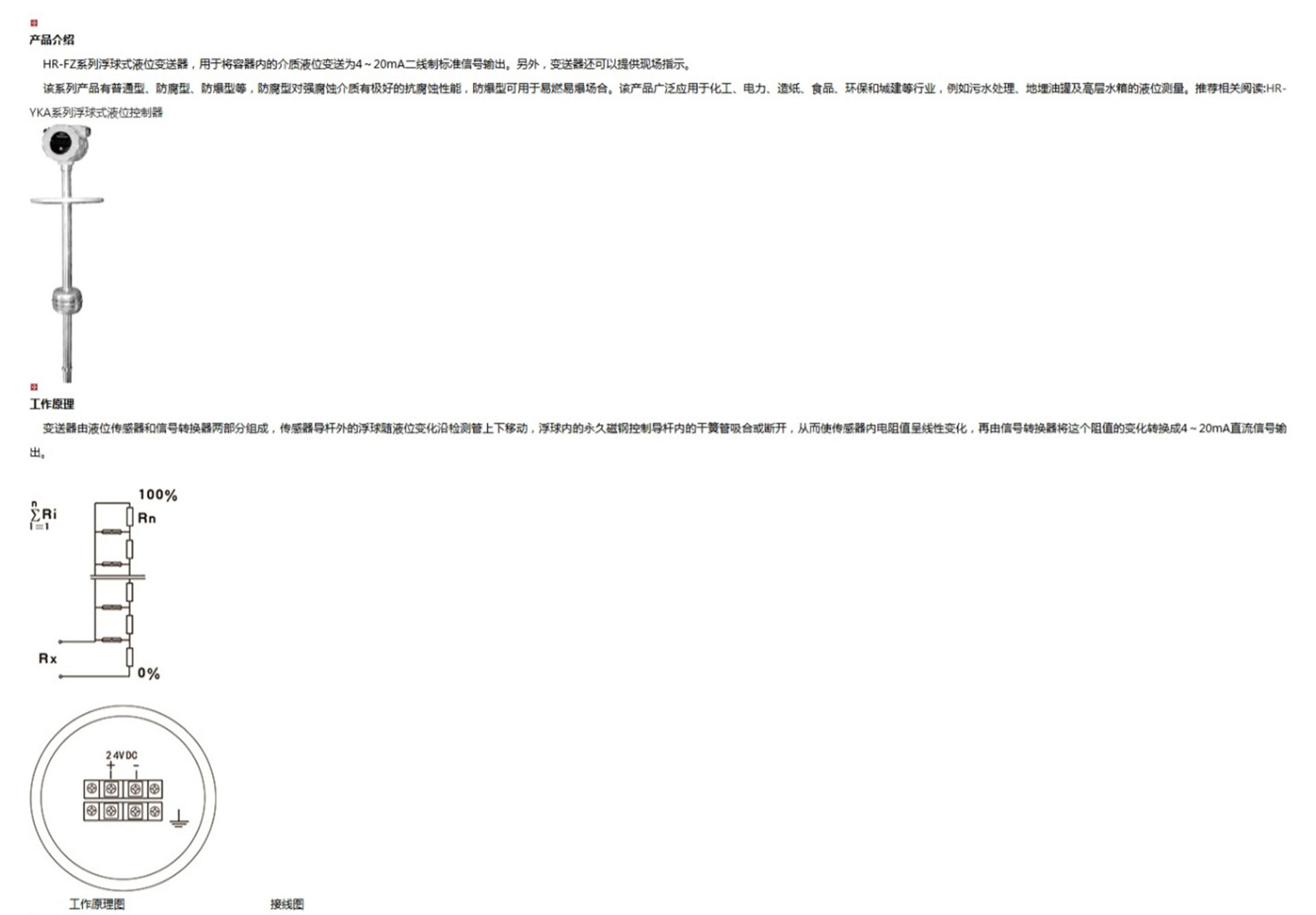 HR-FZ系列浮球式液位變送器,用于將容器內(nèi)的介質(zhì)液位變送為4~20mA二線制標準信號輸出。另外,變送器還可以提供現(xiàn)場指示。